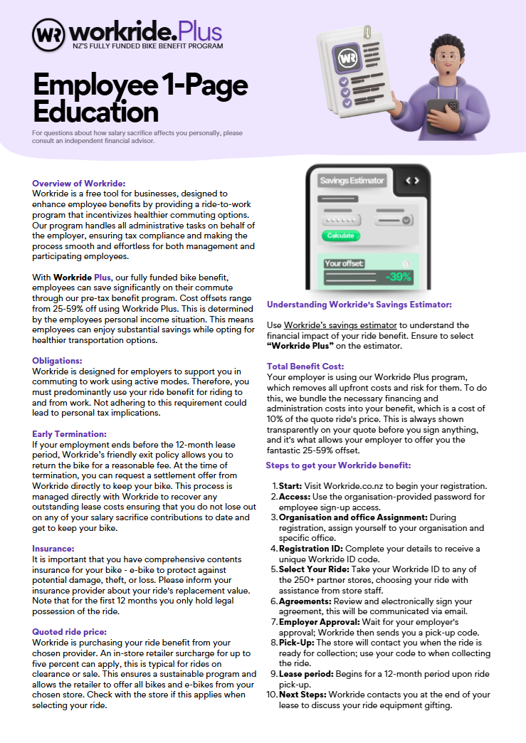 An example of what can be contained in a 1-pager employee education document seen below. Also please contact your Workride Account manager for this templated 1-pager: