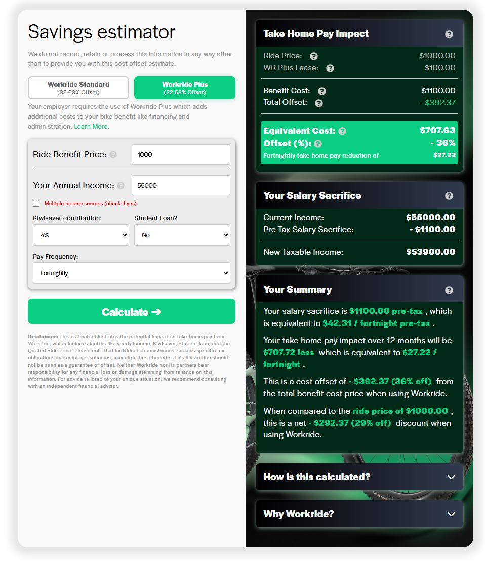 Use Workride’s savings estimator to see the financial impact of your ride benefit. For questions about how salary sacrifice affects you personally, please consult an independent financial advisor. Link to savings estimator Important: When using the estimator, your employees must select the "Workride Plus" tab to get an accurate calculation, as this version includes the necessary financing and admin costs.